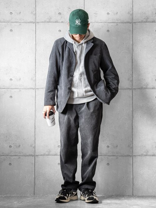 ダークグレーのセットアップに、ライトグレーのパーカーを合わせたカジュアルスタイルです。かっちりとしがちなジャケットも、インナーのフードで程よくラフな印象に。リラックス感のあるシルエットが魅力です。