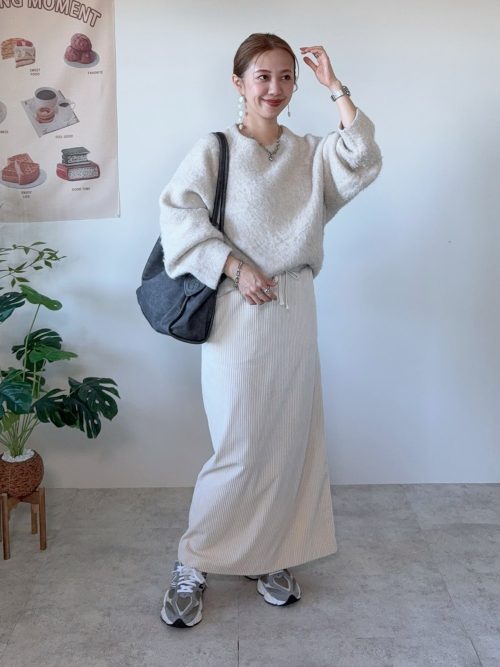 起毛感のあるふんわりとした白ニットに、同系色のスカートを合わせた柔らかなワントーンコーデです。上下の色味を揃えることで、統一感のある大人の着こなしを演出。リラックス感のあるシルエットも魅力です。