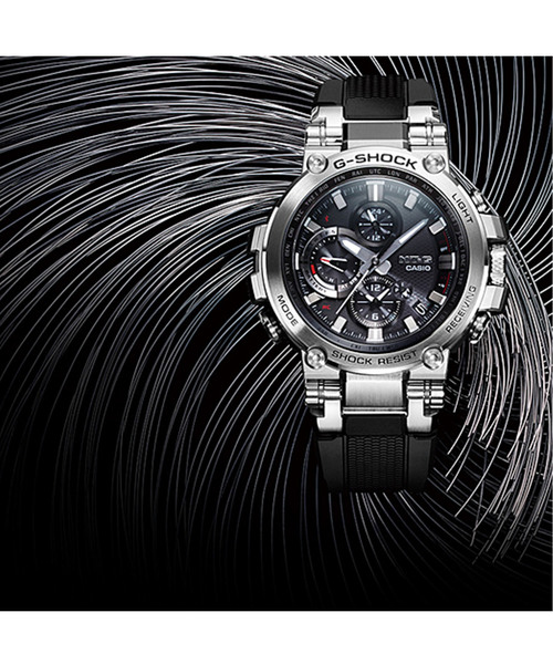 G-SHOCK MT-Gシリーズは、金属と樹脂の融合をコンセプトにするコレクションです。カーボンファイバー強化樹脂製のインナーケースをメタルパーツで保護する「デュアルコアガード構造」を採用し、高い耐衝撃性を実現しています。