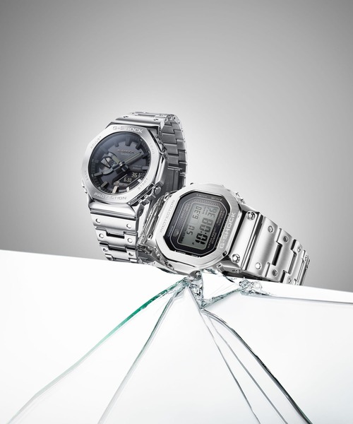 フルメタル仕様のスクエアデザインが際立つ、G-SHOCKの腕時計です。ステンレス製のメタルベゼルとケース間にファインレジン緩衝体を挟む耐衝撃構造でフルメタル化を実現。裏蓋には、耐摩耗性に優れるDLC処理を施したスクリューバックケースを採用しています。