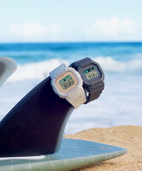 タイドグラフとムーンデータを搭載した、サーフィン向けG-SHOCKの腕時計です。潮の満ち引きや月齢・月の形を確認できるため、海でのライディングをしっかりサポート。耐衝撃構造と20気圧防水を備え、ハードなマリンシーンでも頼りになります。