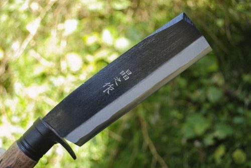 ワイルドな黒打ちで仕上げた鉈です。ブレードには、鋭い切れ味が長続きする青紙二号を採用。黒仕上げは鋼を保護する役割も果たすため、長く愛用できるのが魅力です。