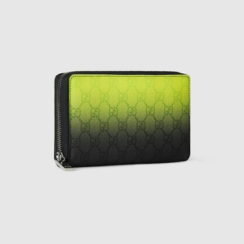 爽やかな色味のグラデーション効果を全体に施した、ジップウォレットです。GGパターンコーティングファブリックにライム・ブラックのグラデーションプリントを組み合わせ、定番スタイルに新しい表情を与えています。内側はブラックのモアレライニングで、上質な仕上がりを実現しています。