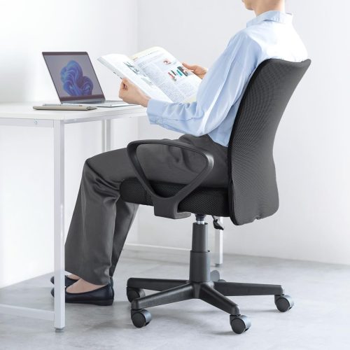 腰を支えるサポートバーを備えた安いオフィスチェア。背もたれと座面には通気性のよいメッシュ素材を使用しており、長時間座っていても蒸れにくいのが魅力です。快適な作業環境をサポートします。