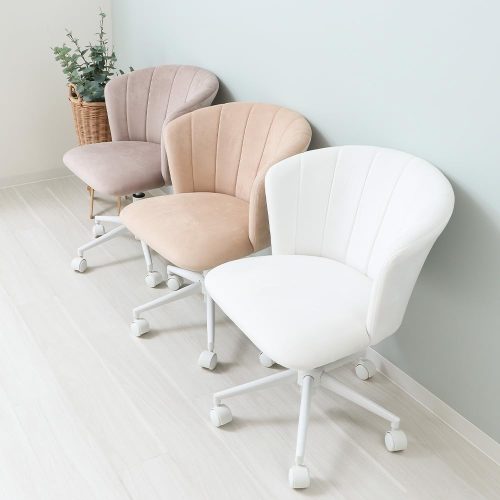 体をやさしく包み込む、かわいいシェル型のデスクチェア。肌触りのよいベロア生地と上品なカラーが特徴です。白い脚とキャスターが、部屋をおしゃれに演出します。