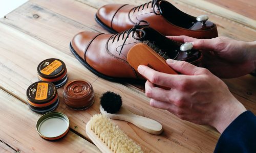 その後、革靴用クリームを適量クロスにとり、靴全体に塗布。豚毛ブラシを使って馴染ませて行くのがポイントです。最後に乾いた布で余分なクリームなどを拭き取ります。山羊毛ブラシで仕上げをするをさらに美しく仕上がるのでおすすめです。