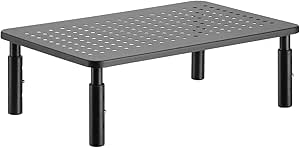 幅を約43cm・47.5cm・52cmの3段階で調節できるモニター台。モニターの高さは約8.5cmで、視線を上げて作業を進められます。ABS素材と4本のステンレス丸棒で作られた頑丈な構造で、約25kgまでの重さに対応可能です。