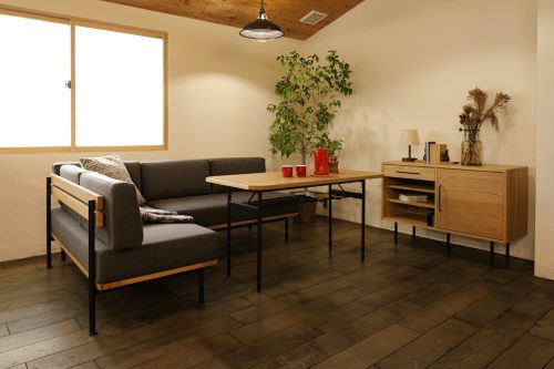 ダイニングソファでは、「リビングでもダイニングでもつかえるシリーズ」を展開。食事とくつろぎ両方に適した座面高で、限られたスペースでも快適に過ごせる設計です。座面にはモールドウレタンクッションを使用し、適度な硬さと耐久性を両立。アームの取り外しが可能で、ベンチやソファとして使い分けられます。