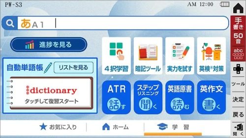 読み方がわからない漢字や複雑な漢字を調べたいときに、手書き入力機能があると便利です。付属のペンや指で画面に直接文字を書き込むことで、キーボードで入力できなくても簡単に検索や入力ができます。特に学生にとっては、漢字の読み方がわからない場合や他言語学習時にも役立つ機能です。