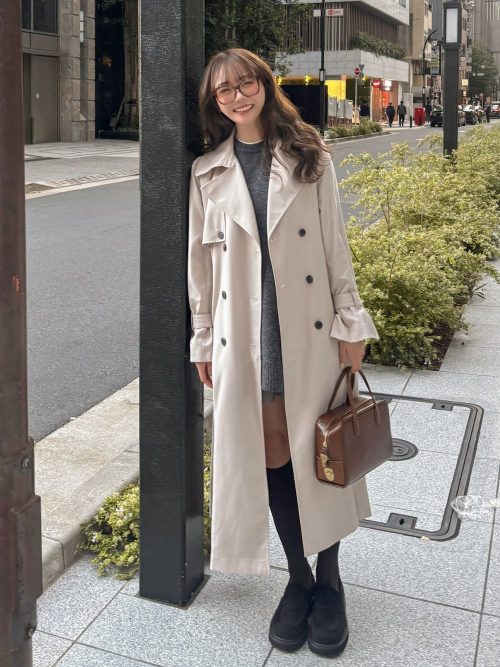 ベージュのロングトレンチコートを主役にしたフェミニンコーデです。なかにはグレーのニットとミニ丈のボトムスを組み合わせ、抜け感を演出。ブラウン系のメガネやバッグをチョイスし、季節感をプラスしています。