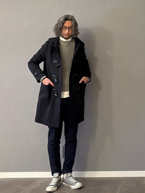 ネイビーのダッフルコートを主役にした、冬のきれいめカジュアルコーデです。インナーにはケーブルニットに襟付きシャツをレイヤードし、トレンド感を演出。足元のカラーリングとマッチしており、シンプルながらおしゃれ見えするルックスに仕上げています。