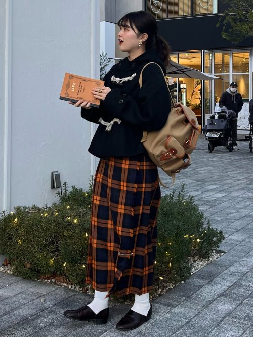 チェック柄ロングスカートを主役にした、プレッピーな秋冬スタイルです。ショート丈のダッフルコートをあわせ、ボトムスとのバランスを整えています。すっきりとしたシルエットでレトロな雰囲気を演出できる、おすすめのコーデです。
