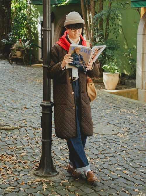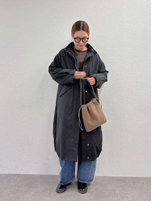 また、モッズコートの色味とあわせたシューズで、重厚感のある装いを演出しているのもポイント。加えて、巾着タイプのショルダーバッグで軽やかさをプラスしており、バランスのよいルックスで着こなせます。街歩きもサマになる、トレンディーでおしゃれなコーデがしたい方におすすめです。
