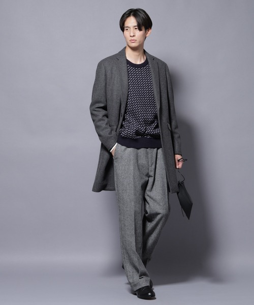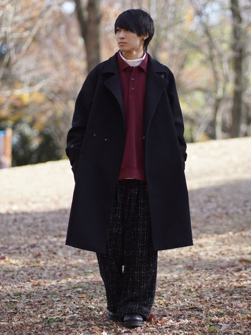 深みのあるカラーリングのアイテムをチョイスした、秋冬向けのメンズコーデ。ゆったりとしたシルエットのコートに、柄物のワイドパンツをあわせています。落ち着いた雰囲気ながら、程よくアクセントを効かせたコーデがしたい方は参考にしてみてください。