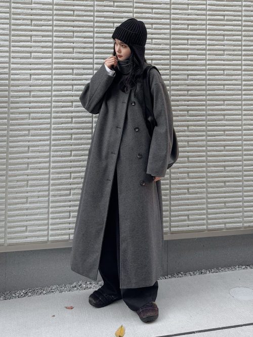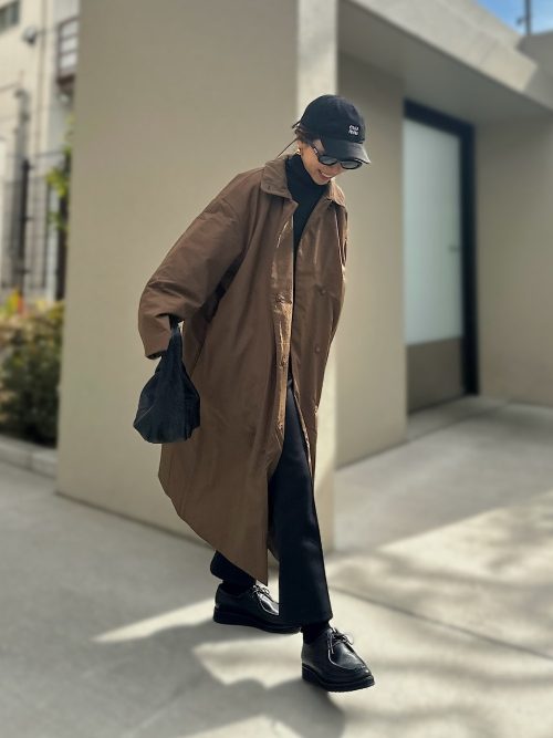 そのほか、ステンカラーコートの襟を立てて着用し、トレンド感を演出。小物には、黒のニット帽とショルダーバッグをチョイスして重心のバランスを整えています。リラックス感のある装いにモードな要素を取り入れた、こなれ感のあるコーデがしたい方におすすめです。