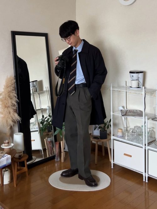 また、ボトムスもコートと同系色で揃え、全体に統一感を持たせているのもポイント。すっきりとしたIラインのシルエットで、知的かつ落ち着いた印象で着こなせる、おすすめのメンズコーデです。