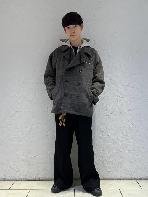 ピーコートにパーカーをレイヤードしたメンズコーデです。ボトムスにはセンタープリーツが施されたワイドフレアパンツをチョイスし、シックな装いに仕上げています。きれいめストリートコーデが好みの方は、参考にしてみてください。