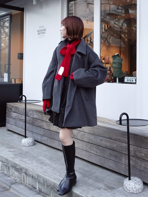 また、鮮やかな赤のマフラーや手袋が、コーデの差し色としてアクセントを加えているのもポイント。マフラーはリボン結びにし、華やかな印象に仕上げています。アイテムの配色でこなれ感を演出した、おすすめのコーデです。