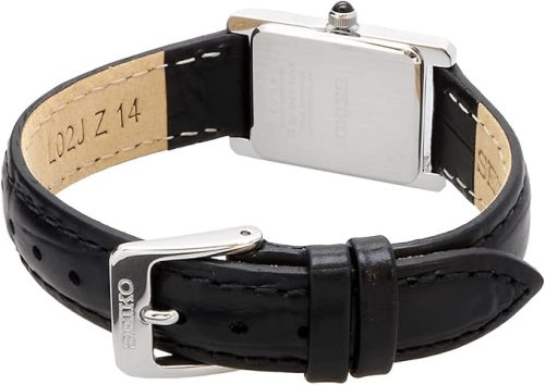 スクエアなケースが目を引くセイコーの腕時計。インデックスにはローマ数字を採用しており、クラシカルな雰囲気が漂っています。ゴールドトーンのケースとブラックのレザーベルトのコンビネーションが上品でエレガントな印象です。
