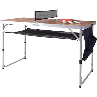 卓球ができるアウトドアテーブル。普段は通常のテーブルとして活躍し、バーを起こしてネットを付ければ卓球台に早変わりします。木目調のおしゃれな見た目が魅力です。