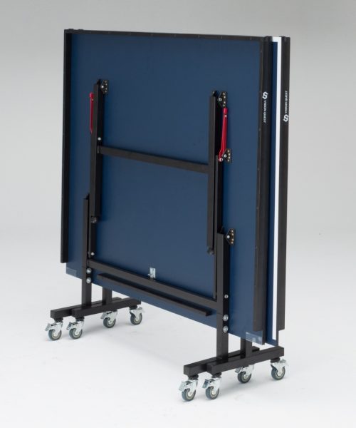 滑らかな操作で簡単に設営できる内折式の卓球台。天板取付式の特殊な蝶番を採用しており、スムーズなセッティングが可能です。国際公式サイズなので、本格的な練習にも対応します。