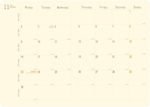 ウィークリーページはホリゾンタル形式で、左側に予定とタスク管理用のスペース、右側に自由度の高い方眼メモ欄を配置。見開き1カ月のマンスリーページでは6段式カレンダーを採用しており、6週になる月の最終週も予定がしっかり書き込めます。