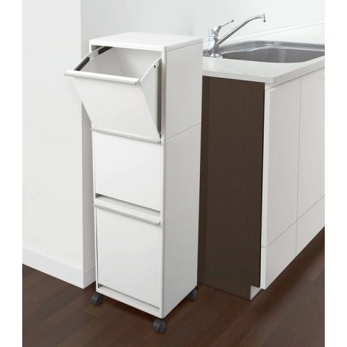 ゴミ分別と収納を両立した便利なアイテムです。1個あたり15Lのゴミ箱が3個備わっており、ゴミを種類ごとに分別できます。天板は作業台として活用できるほか、大小の引き出しが付いているため、調理器具や消耗品の収納も可能です。