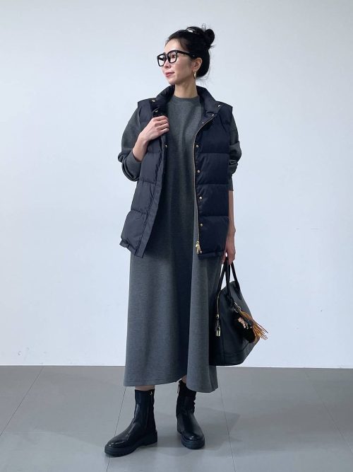 グレーのロングワンピースに黒のダウンベストを重ねた、きれいめカジュアルなコーデです。ベストにあしらわれたゴールドの金具が上品なアクセントに。全体をモノトーンカラーでまとめることで、落ち着いた大人の雰囲気を演出しています。