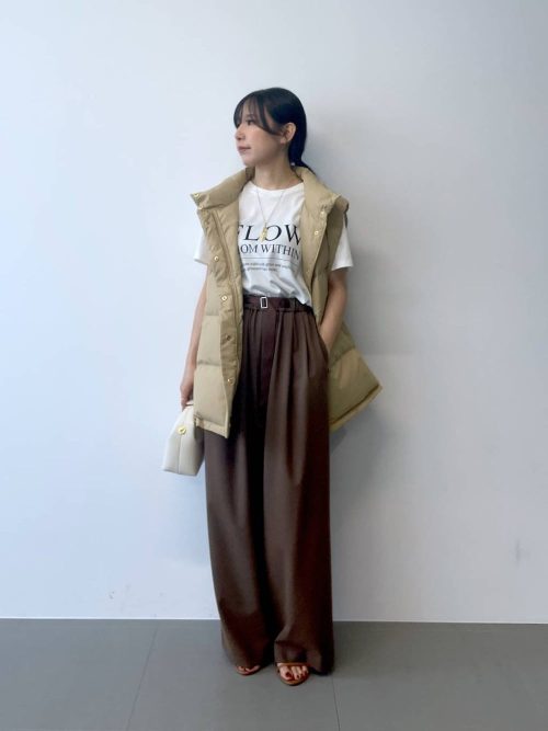 ベージュのダウンベストにブラウンのワイドパンツをあわせた、きれいめカジュアルコーデです。インナーのロゴTシャツが、程よい抜け感をプラス。アースカラーで統一した、落ち着きのある雰囲気が魅力です。