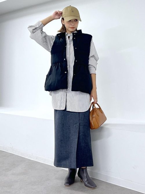 ストライプ柄のシャツに黒のダウンベストを重ねた、大人カジュアルなコーデです。ボトムスには、フロントスリットが入ったチャコールグレーのロングスカートをあわせて縦のラインを意識。ウエストに切り替えのあるダウンベストが、女性らしさをプラスします。