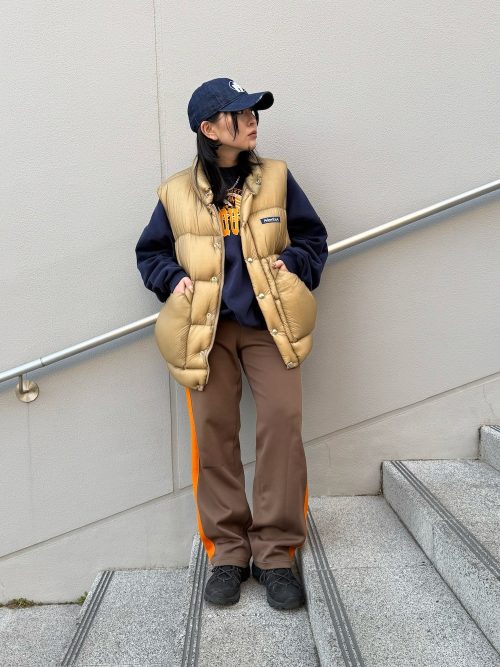 ベージュのダウンベストを主役にした、カジュアルなコーデです。インナーにはカレッジロゴが印象的なネイビーのトレーナーを着用。ボトムスにはサイドにオレンジのラインが入ったブラウンのトラックパンツをあわせ、スポーティーな雰囲気にまとめています。