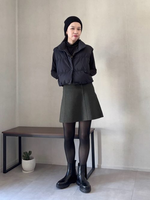 黒のダウンベストを主役にした、大人かわいいコーデです。インナーに黒のタートルネック、ボトムスにダークカラーのAラインミニスカートをあわせています。全体をシックな色あいで統一しつつ、スカートのシルエットでフェミニンさをプラスしたスタイルです。