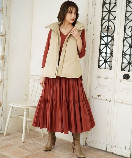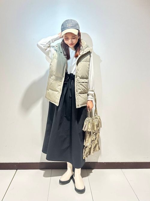 ダウンベストは、あわせるボトムスによって印象がガラッと変わります。女性らしさを出したいなら、スカートをあわせるのがおすすめ。大人っぽくしたいときはマーメイドスカートやタイトスカート、フェミニンにはボリュームのあるスカートを選びましょう。
