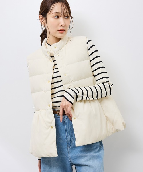 ペプラムデザインが女性らしさを演出するダウンベストです。気になる腰回りをカバーしつつ、カジュアルすぎない印象で着用できるので大人かわいい服装が好きな方におすすめ。ブラックとオフホワイトの2色展開で、どちらもコーデに取り入れやすいカラーです。