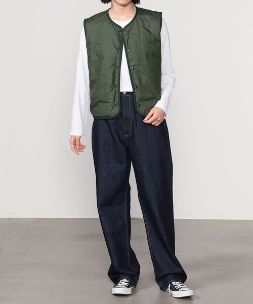肌寒い秋や春は薄手のTシャツやシャツなどとあわせたり、冬は厚手のスウェットやニットとあわせたりと幅広い着こなしを楽しめむことが可能。ダウンベストは面積が少ない分インナーが目立ちやすいため、トレンドのレイヤードスタイルもサマになります。