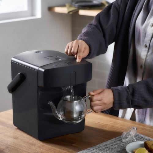 シンプルでおしゃれな電気ポット。インテリアに自然に馴染むデザインが魅力的です。5段階の温度調節機能を搭載しており、60~98℃の範囲で約10℃単位の設定が可能。緑茶は70℃、コーヒーは90℃といったように、飲み物に合わせて最適な温度のお湯を準備できます。