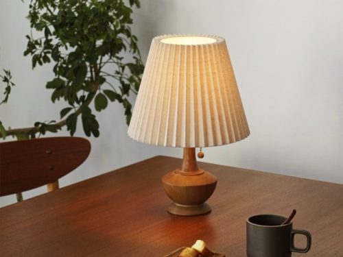 プリーツセードからやわらかな光が広がるテーブルランプ。北欧ビンテージ家具をモチーフにした、ぬくもりあるウッドベースが特徴です。繊細な光が空間をやさしく包み込みます。