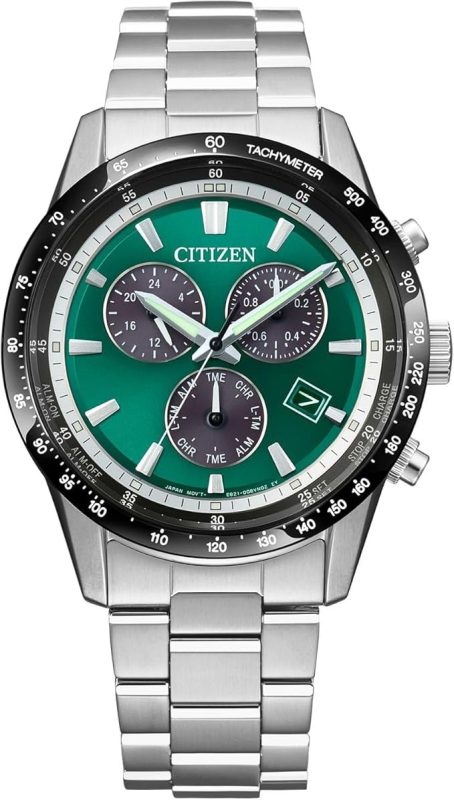 クロノグラフ機能を備え、1/1秒単位で最大60分まで計測可能。24時間表示や日付表示も搭載し、実用性を高めています。夜光の針とインデックスで、夜間でも時刻を確認しやすいのがポイントです。