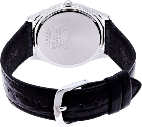 ケースサイズは36.2mmとほどよいサイズ感で、厚みも9.9mmに抑えられています。ステンレス製のケースに球面クリスタルガラスを組み合わせ、シンプルで飽きにくいデザインに仕上げられているモデル。三ツ折プッシュタイプの中留を備えたバンドは、着脱もスムーズです。
