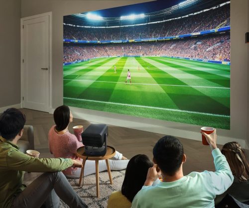 壁から2.5mの距離があれば100インチの映像を投影でき、5mだと150インチの大画面を楽しめます。投影位置を柔軟に調節可能です。
