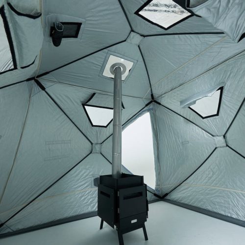 W110×H87cmの大きな窓が備わっているため、テント内から屋外の景色を楽しめます。また、ゴムの弾性によって、内側から押すだけで開くスウィングドアを採用。出入りのたびの放熱を抑えます。ステンレス製ストーブには遮熱シールドを備えており、周囲の安全を確保しやすい設計です。