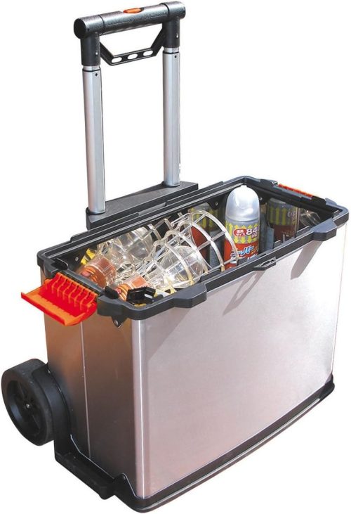 アウトドアから室内まで活躍する、ボックスタイプのキャスター付き工具箱。片側を持ち上げるだけで簡単に移動できます。