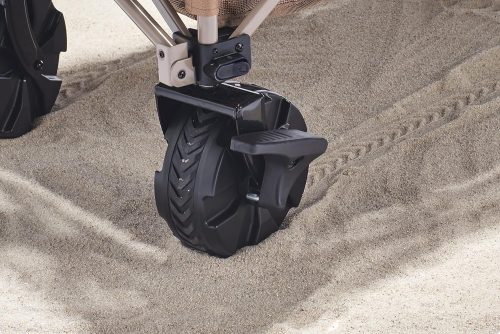 大型タイヤを採用しているのもポイント。滑りやすい芝生の上はもちろん、ビーチや河原でも走行でき、道を選びません。布地は取り外せる仕様で、お手入れは楽に行えます。