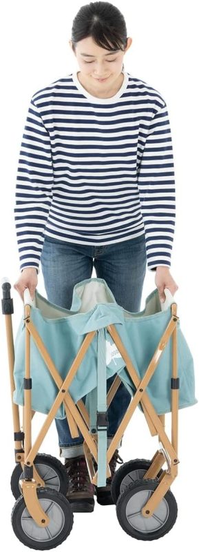 前輪は360°回転する仕様。狭い道でも小回りが利きます。組み立てはフレームを広げるだけ。収納も簡単に行えます。アウトドアはもちろん、日常の買い物で荷物を運ぶときにもおすすめです。