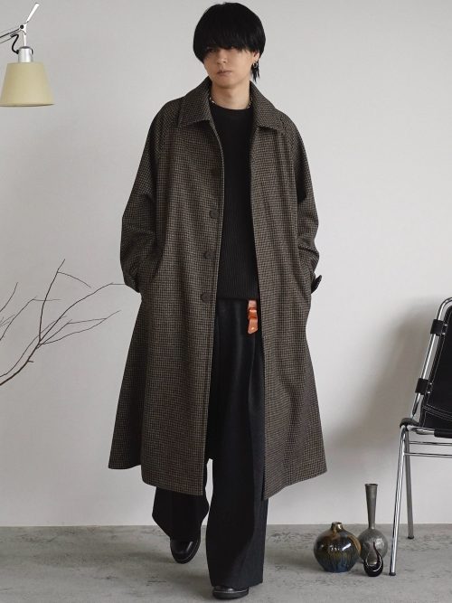 細かいチェック柄のステンカラーコートを主役にしたメンズコーデです。インナーとボトムスはブラックで統一し、コートのデザインを引き立てています。シンプルなカラーリングでスプリングコートを着こなしたい方は、参考にしてみてください。