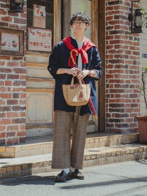 ネイビーのノーカラーコートに、鮮やかな赤のニットを肩掛けしたレトロなメンズコーデです。シンプルな白のバンドカラーシャツをあわせて、顔周りをすっきりと明るく見せています。色のコントラストが目を引く、春らしい装いがしたい方は参考にしてみてください。