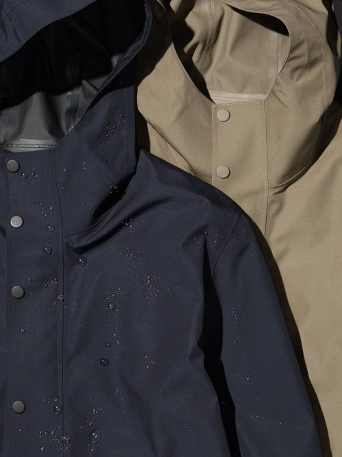 防風性と透湿性を備えた高機能素材のコートです。撥水加工に加え、ファスナーにも撥水性があるモノを採用。さらに、フードのアジャスターと袖口のドットボタンでフィット感を調節でき、雨や水の侵入を軽減します。