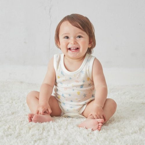 伸縮性のあるリブ素材を使用した、キャミソール型の肌着です。深めに開いたアームホールで、肩まわりの動きを妨げにくいのが特徴。赤ちゃんの活発な動きにしっかりフィットします。タグを外側に付け、チクチク感を軽減しているのもポイントです。