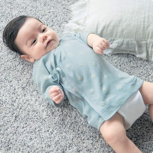 前開きの紐結びタイプで、赤ちゃんの体に合わせてフィット感を調整可能。襟ぐりにゆとりを持たせ、快適な着心地に仕上げています。あたたかい日は部屋着としても使える、おしゃれなベビー肌着を選びたい方にもおすすめです。