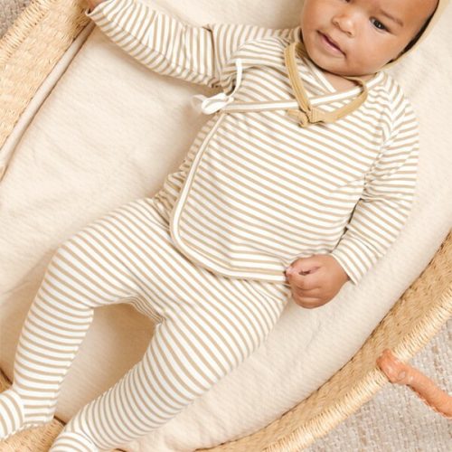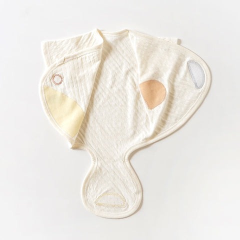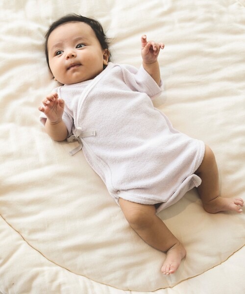 赤ちゃんの体に合わせて、打ち合わせ部分は紐で調整可能。股下はスナップボタン仕様で、おむつ替えがスムーズに行えます。デザインも肌触りもよく、ギフトとしても喜ばれるアイテムです。